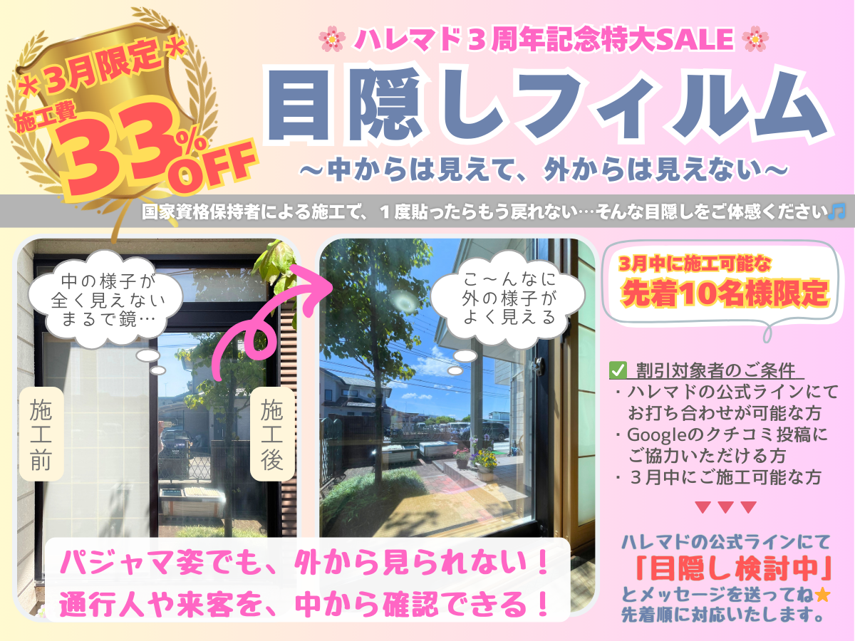 本日3周年を迎えました🪟✨ いつもありがとうございます。 ハレマドの大井でございます☺︎ 当店は、2026年3月1日で開業3周年を迎えることができました! ご縁をいただいたお客 […]